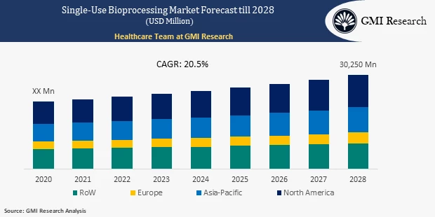 Single-Use Bioprocessing Market is anticipated to touch USD 30,250 million by 2028, exhibiting a 20.5% CAGR during the forecast period (2021-2028), owing to the growing demand for pharmaceutical products.