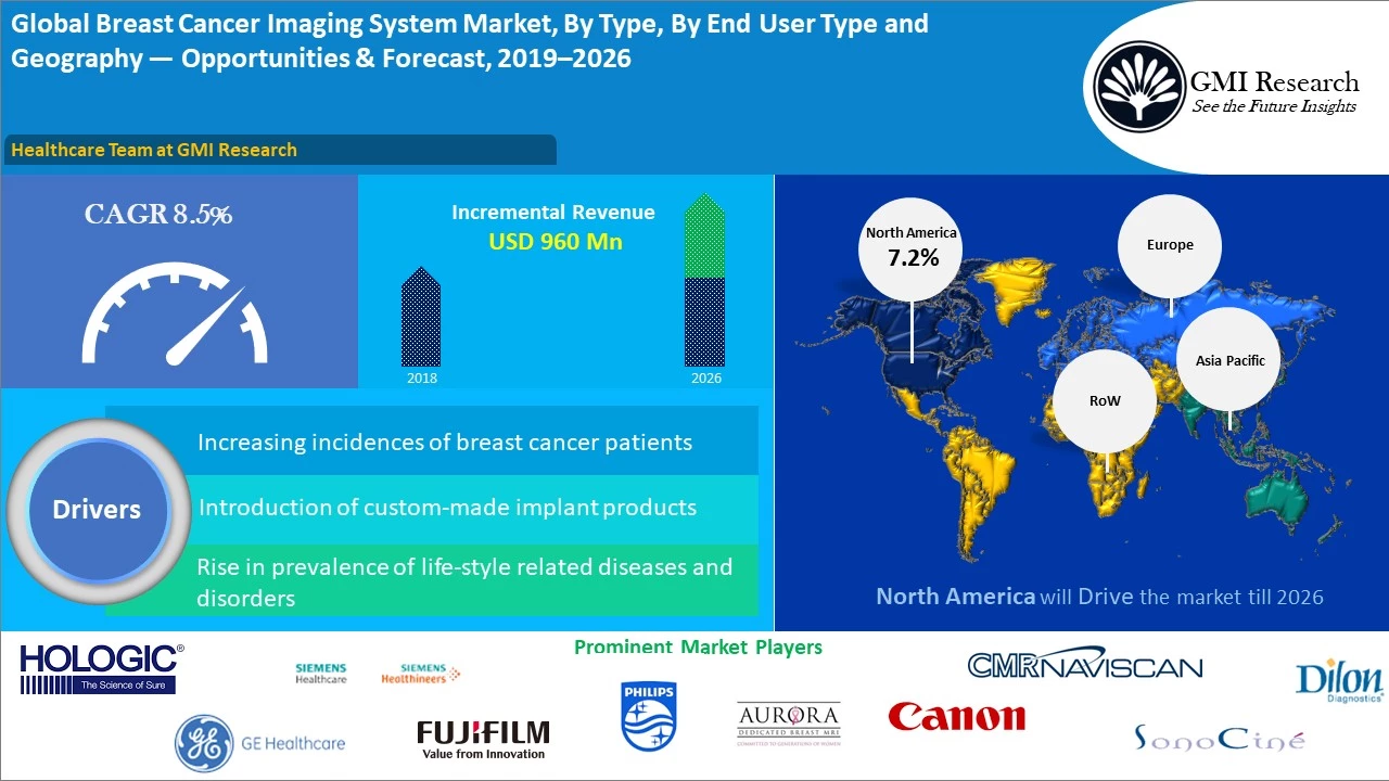 The global market for breast cancer imaging has expanded rapidly in recent years and expected to grow at a robust rate in the coming years also. The global breast cancer imaging was estimated at USD 1,055 million in 2018, and is projected to reach USD 2,246 million by 2026, growing at a CAGR of 8.5% during 2019-2026. The key factors bolstering the growth of the market include increasing incidences of breast cancer patients, introduction of custom-made implant products, technological advancement in imaging devices, rise in prevalence of life-style related diseases and disorders and various cancer screening campaigns run by institutions. In 2019 in United States it is expected that 268,600 fresh cases of invasive cancer as well as 62,930 cases of non-invasive cancer is expected to be diagnose.