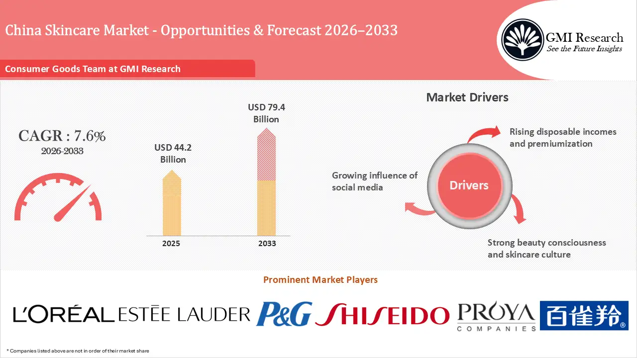 The future of skincare market in China looks very promising owing to growth in demand for skincare products, GMI Research expects skincare demand in China is projected to grow at a compound annual growth rate (CAGR) of over 7.6% in the coming years. In 2025, the market size was worth USD 44.2 billion, with the market size set to crack the USD 79.4 billion barrier by 2033.