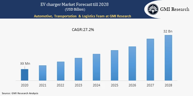 EV charger market is projected to reach USD 32 billion by 2028, exhibiting a CAGR of 27.2% during forecast period.