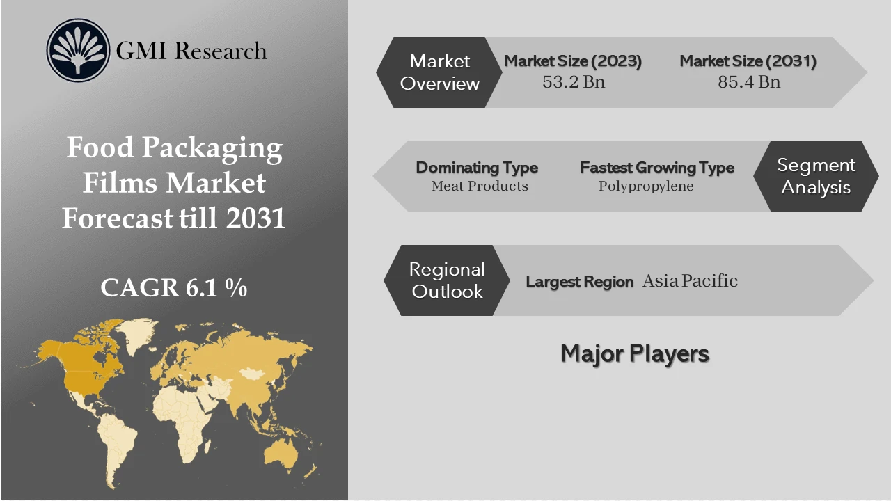 Food Packaging Films Market size reached USD 53.2 billion in 2023 and is estimated to reach USD 85.4 billion in 2031 and the market is estimated to grow at a CAGR of 6.1% from 2024-2031.