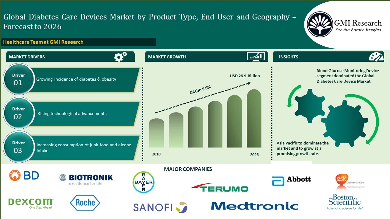 Major key players in the Global Diabetes Care Devices market include Abbott Laboratories, Becton Dickinson and Company, Bayer Healthcare, Roche Holding AG, Medtronic plc, Dexcom Inc, Biotronik SE, and GlaxoSmithKline, among others.