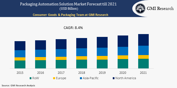 Packaging Automation Solution Market is projected to reach at USD 48 Billion by 2021 at a CAGR of 8.4% during the forecast period.