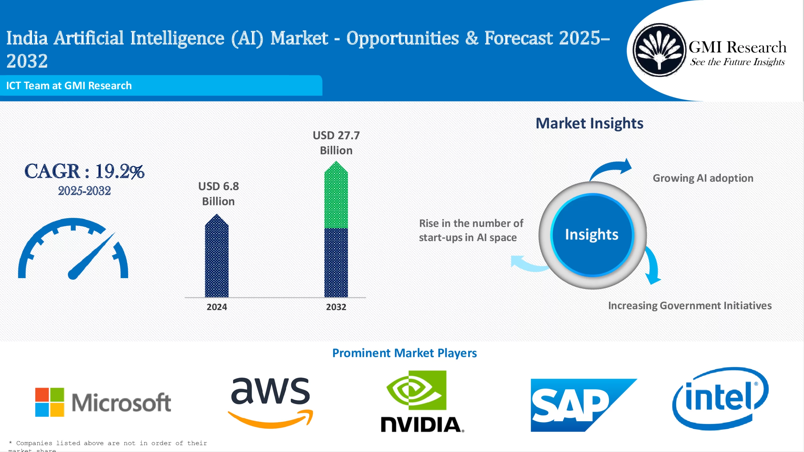 India Artificial Intelligence Market (AI Market) size was estimated at USD 6.8 billion in 2024 and is slated to register a double digit CAGR of 19.2% over the period 2025-2032 and is projected to reach USD 27.7 billion in 2032 primarily driven by growing AI adoption, increasing government initiatives coupled with rise in the number of AI start-up in the country.