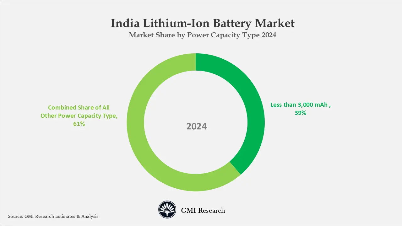 Battery lower than 3,000 mAH capacity hold the largest market share owing to large size of the consumer electronics industry especially the mobile industry which registered total sales of 150 million units in 2024 coupled with large size of mobile manufacturing in India and surge in mobile exports in recent years as the country is the 3rd largest mobile exporter globally.