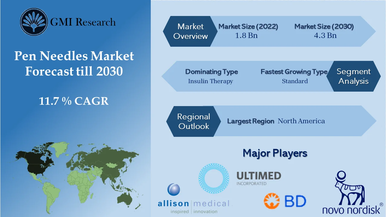 GMI Research analysis indicates that the Pen Needles Market estimated at USD 1.8 billion in 2022 and is slated to register a double digit CAGR of 11.7% over the forecast period, and is projected to reach USD 4.3 billion in 2030.