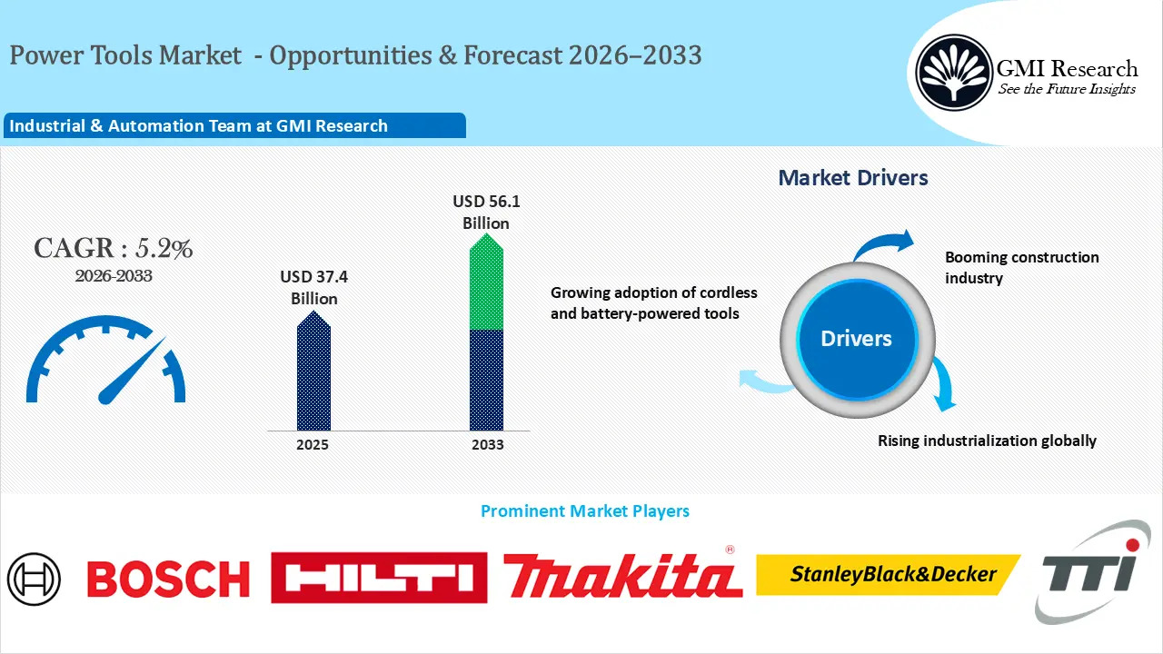 Power Tools Market size reached USD 37.4 billion in 2025 and is estimated to reach USD 56.1 billion in 2033 and is forecast to grow at a CAGR of 5.2% from 2026-2033 propelled by rise in construction & infrastructure development globally, growing adoption of cordless and battery-powered tools, robust industrial growth, and growing reliance on power tools across industries.