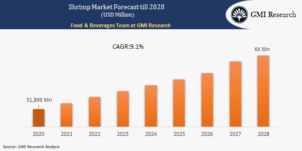 Shrimp Market is accounted for USD 31,899 million in 2020, growing at a robust CAGR of 9.1% during forecast period.