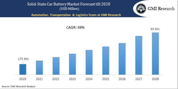 Solid-State Car Battery Market was estimated at USD 175 Million in 2020 and projected to grow at 49% CAGR during the forecast period.