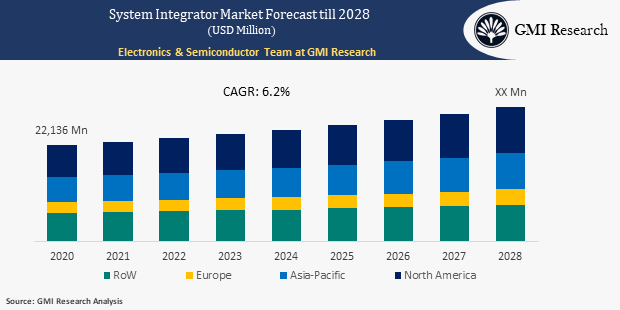 System integrator market was estimated at USD 22,136 million in 2020 and predicted to grow at 6.2% CAGR during forecast period.