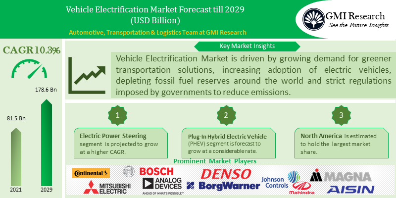 GMI Research analysis indicates that the Vehicle Electrification Market estimated at USD 81.5 billion in 2021 and is slated to register a double digit CAGR 10.3% over the period, 2022-2029 and is projected to reach USD 178.6 billion in 2029.